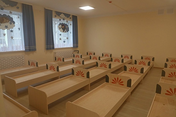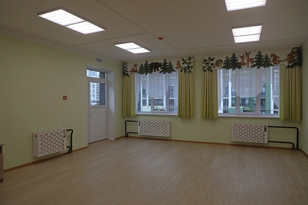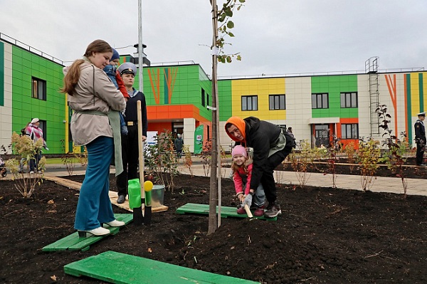 Двухэтажный детский сад рассчитан на 6 групп. Здесь высажено 18 декоративных яблонь и 11 мелколиственных лип. Территорию также украшают гортензии, спиреи и дёрен.