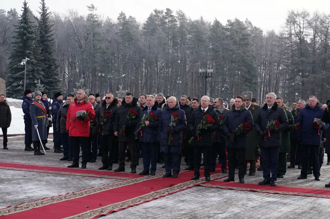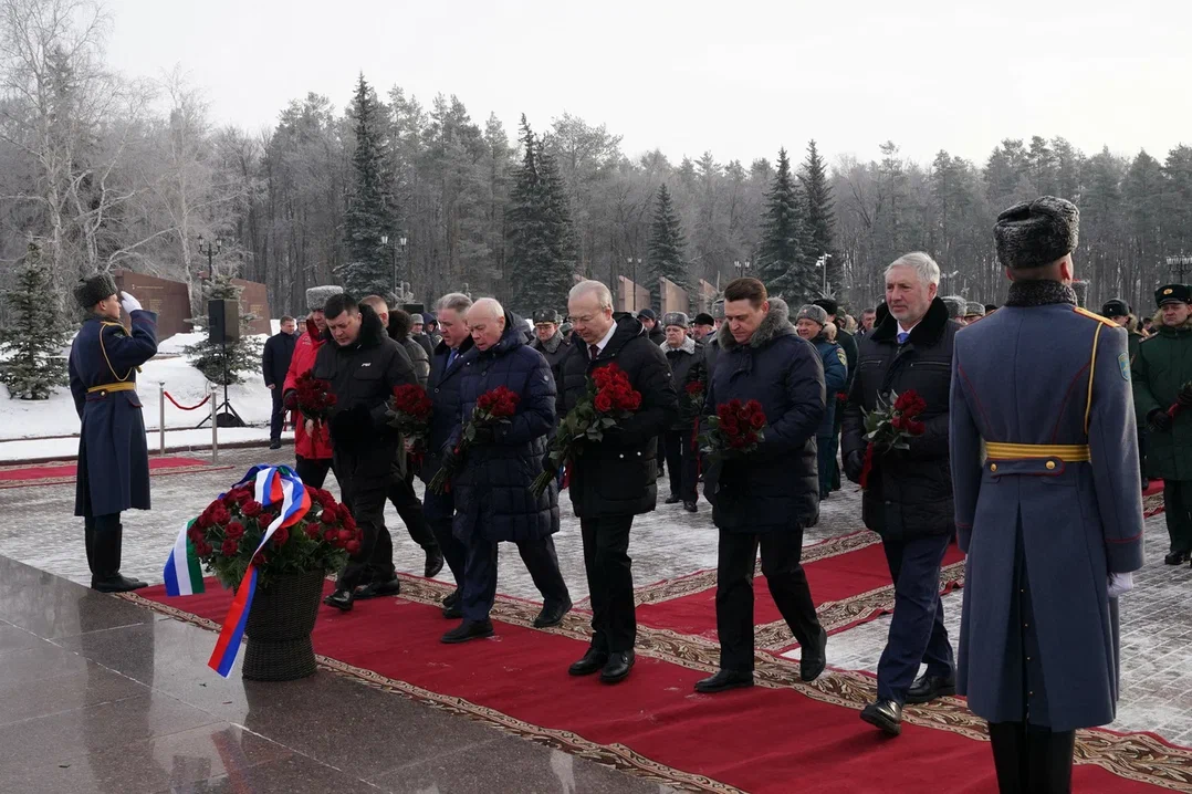 От имени многонационального народа Башкортостана Глава республики Радий Хабиров возложил цветы к памятнику, посвященному бессмертному подвигу Героев Советского Союза Александра Матросова и Миннигали Губайдуллина, у подножия которого горит Вечный огонь, и к памятнику Герою России, легендарному комдиву Минигали Шаймуратову.