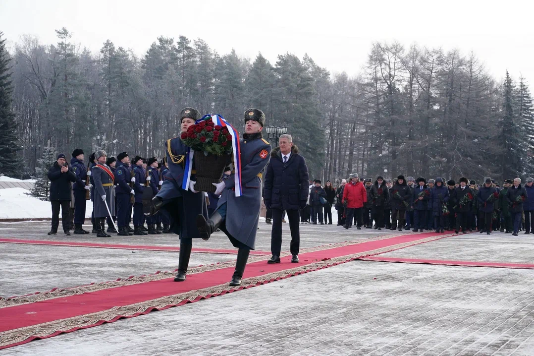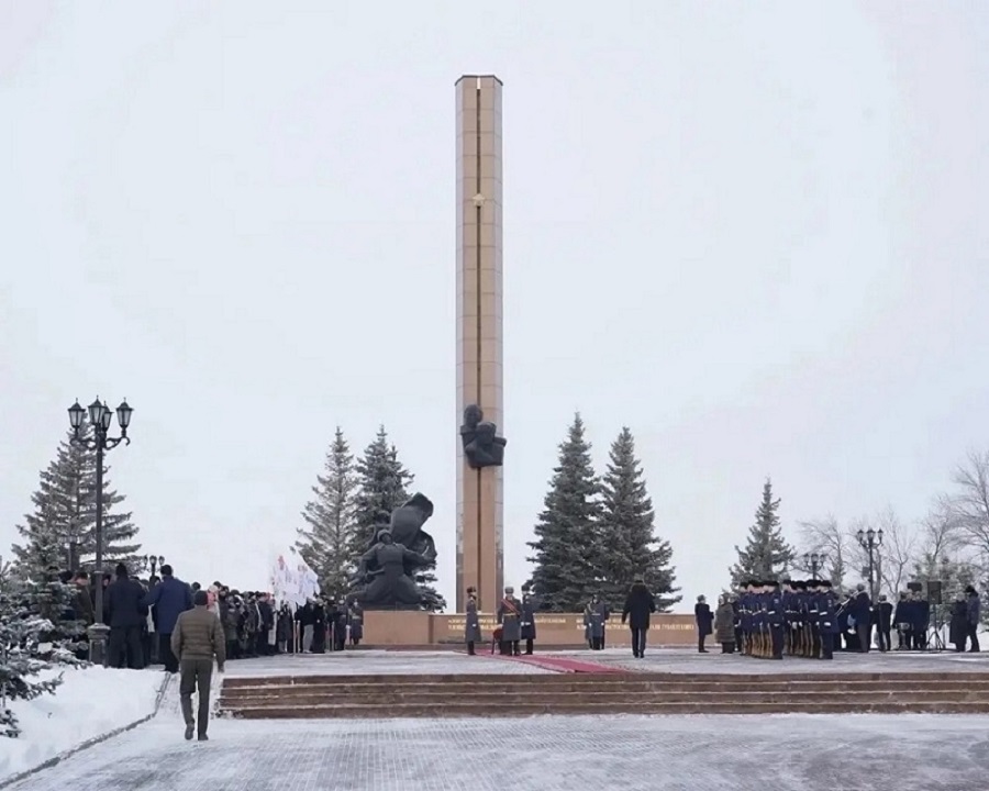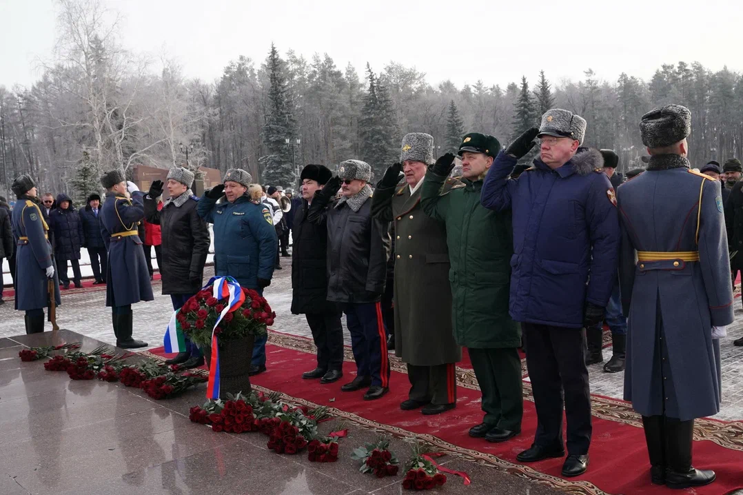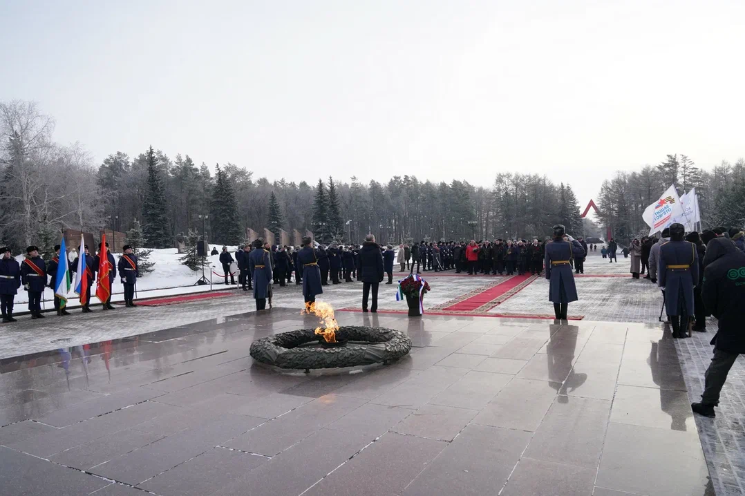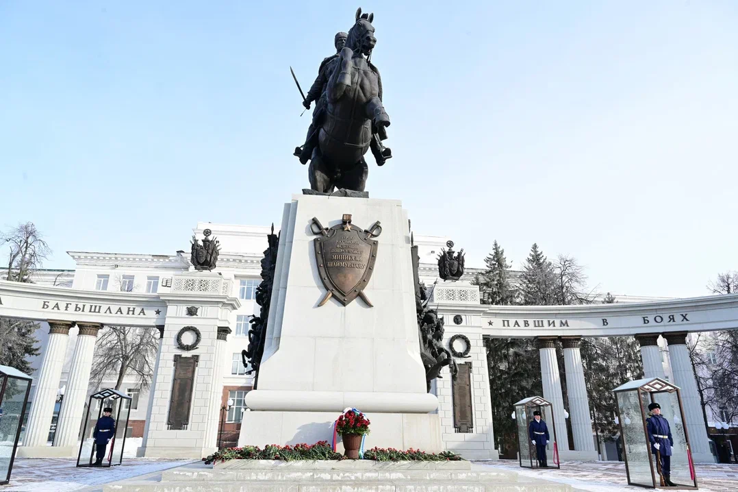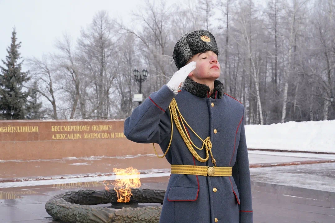 От имени многонационального народа Башкортостана Глава республики Радий Хабиров возложил цветы к памятнику, посвященному бессмертному подвигу Героев Советского Союза Александра Матросова и Миннигали Губайдуллина, у подножия которого горит Вечный огонь, и к памятнику Герою России, легендарному комдиву Минигали Шаймуратову.